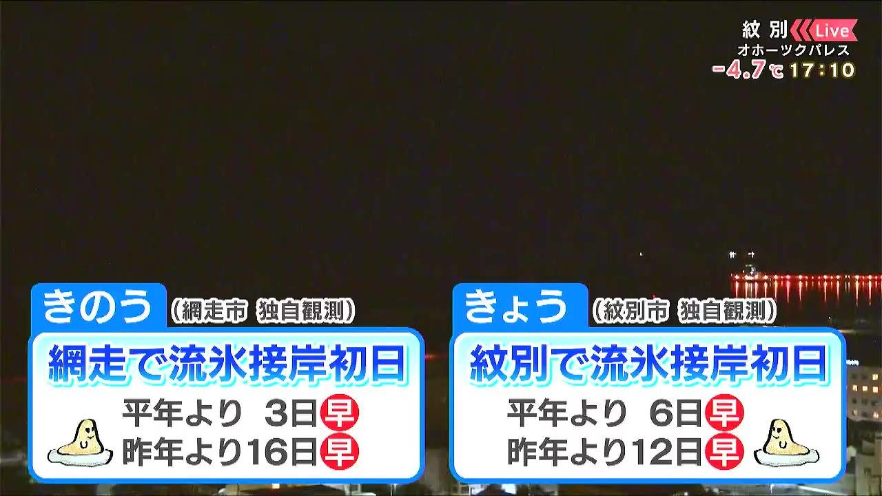 きのう1日(日)は網走で、きょう2日(月)は紋別で「流氷接岸初日」となりました。ともに独自観測で、平年より早くなっています。あす3日(火)もオホーツク海側は穏やかで、流氷観光には良さそうです。