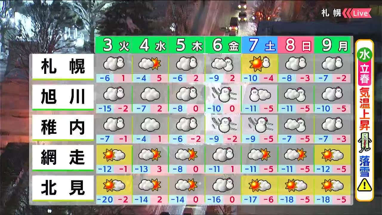 札幌は木曜夜から金曜早朝が雪のピークです。その他の日本海側の海岸部は、金曜から土曜にかけて猛吹雪となるおそれがあります。水曜の「立春」は札幌で5度まで気温が上がるため、落雪事故に注意して下さい。