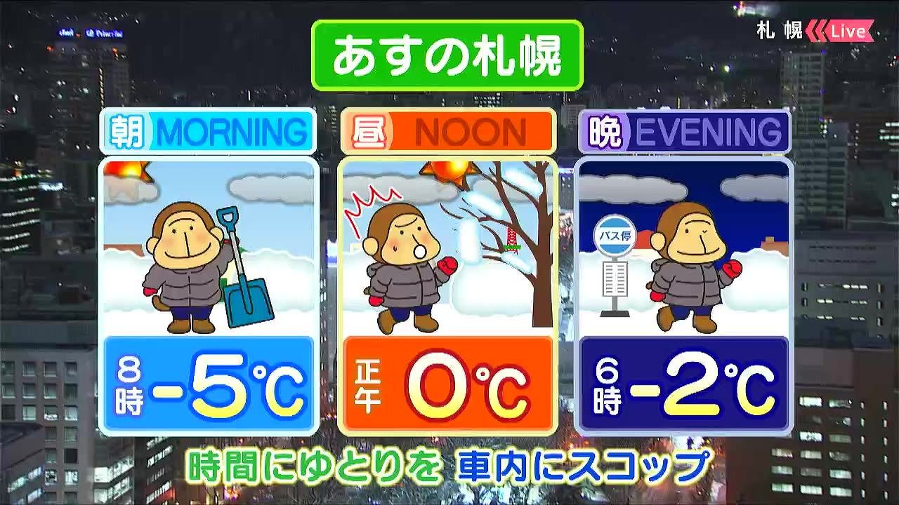 では、あす3日(火)の札幌です!朝昼晩の天気をもんすけでお伝えします!