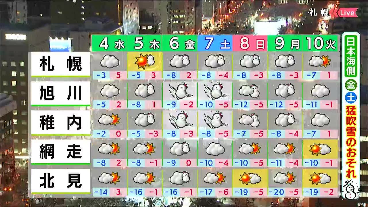 木曜の夜から日本海側で雪が降るでしょう。金曜と土曜は日本海側の海岸部を中心に猛吹雪となるおそれがあります。週末の札幌は、時折雪が降る程度ですが、厳しい寒さになります。
