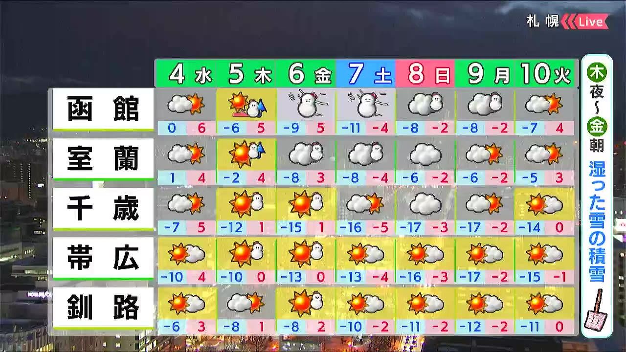 木曜夜から金曜朝は、広い範囲で湿った雪が積もりそうです。金曜と土曜は渡島半島を中心にふぶくでしょう。気温は木曜まで高めですが、金曜の午後から急速に寒くなります。