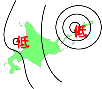 小さな低気圧は、冬型の気圧配置が緩んだ時にできやすく、北海道の内陸で冷えた空気と、大陸から吹く風が海の上に集まることで発生します。