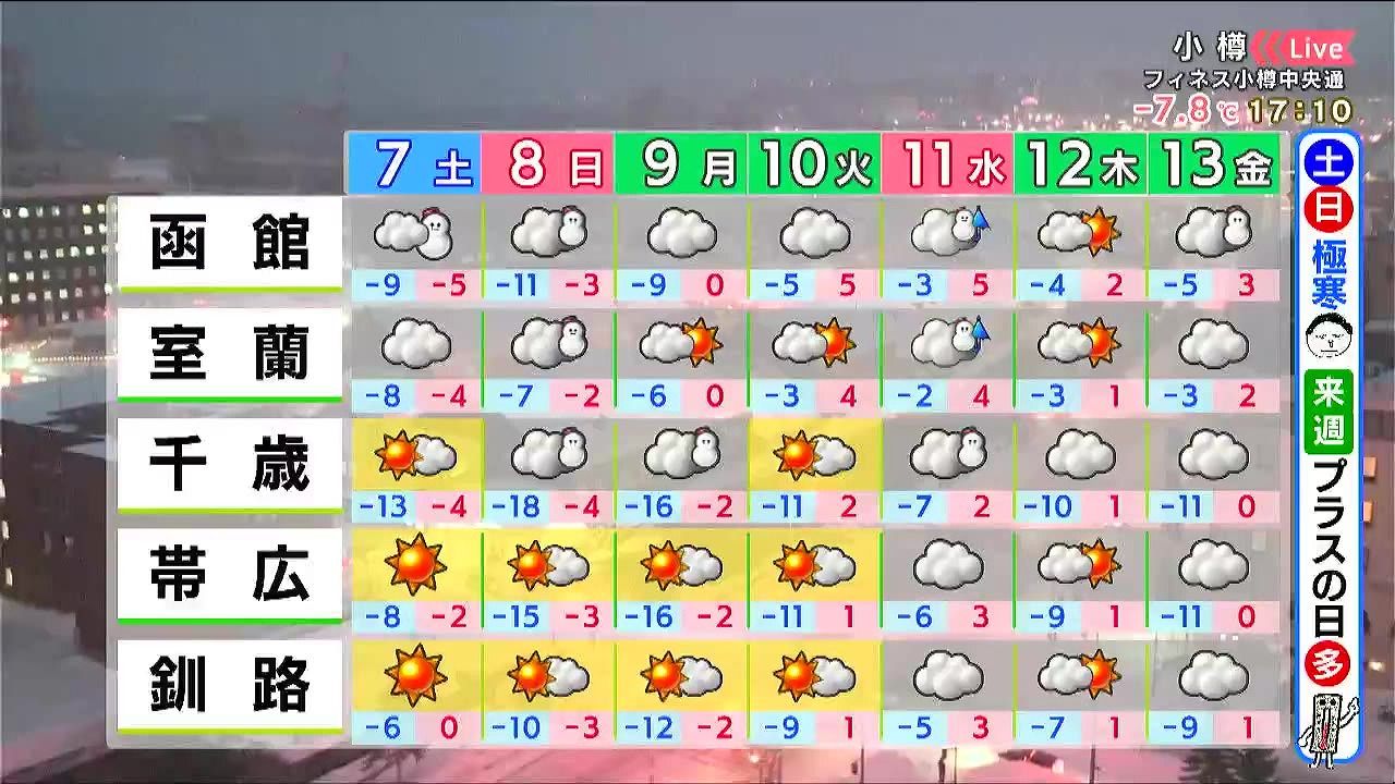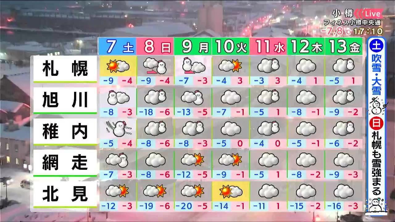 日曜は渡島北部の長万部や八雲周辺で10~20センチの雪が降るでしょう。来週はプラスの気温の日が多くなります。