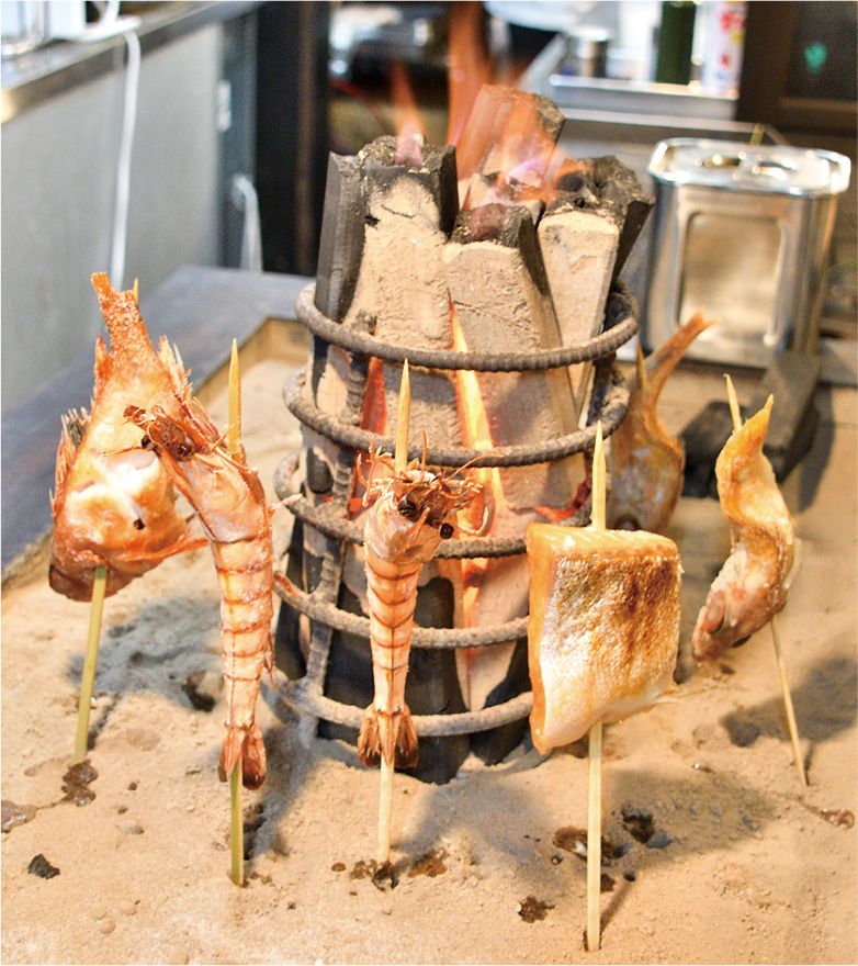 旬の魚介や野菜、新鮮な肉を炭火でじっくり炙る。ジュワッと焼ける音や香ばしい匂い、目の前の臨場感…