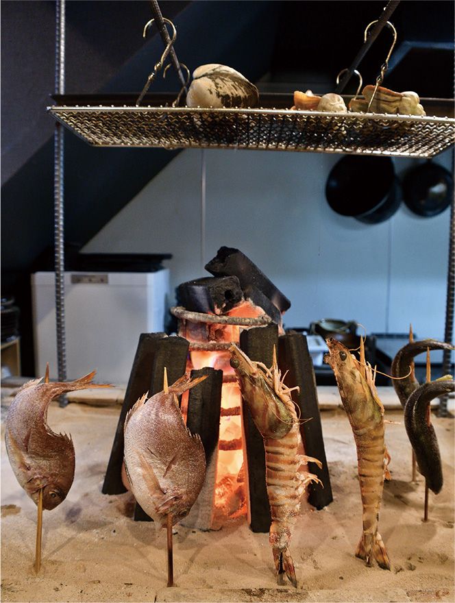 カウンター内に設置したいろりに高く炭を積み、強火の遠火でじっくりと海鮮を炙る「原始焼き」と