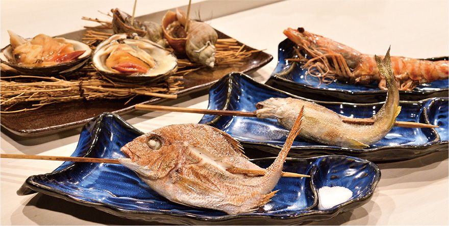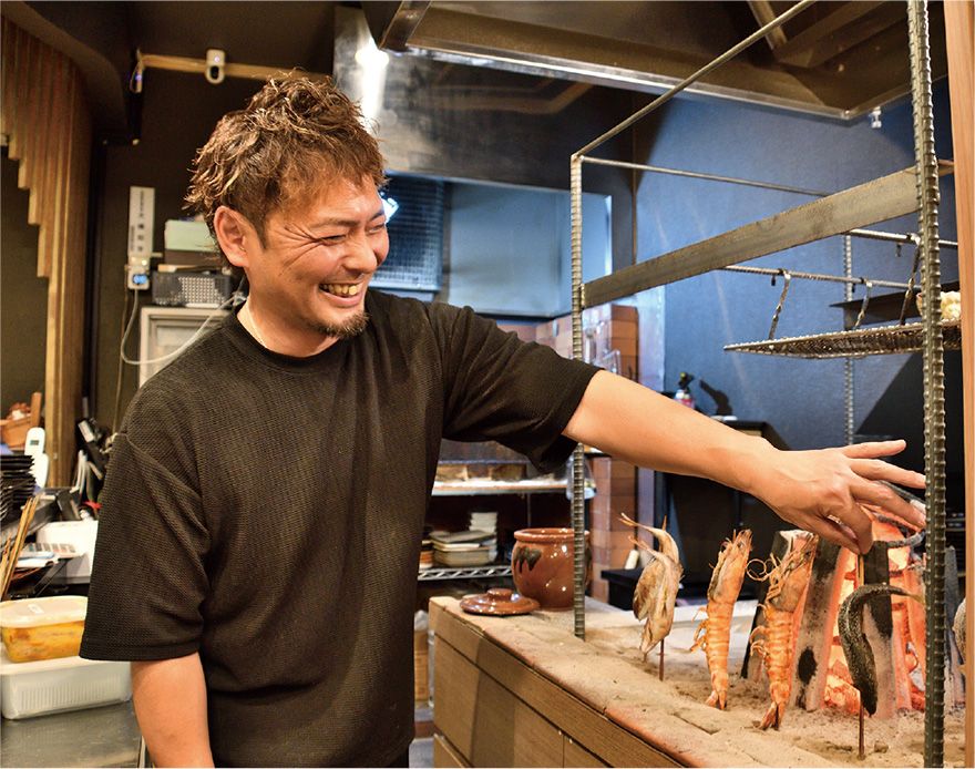 原始焼きの海鮮は、子持ちアユや特大エビを定番に、大槻知世店主が「はこだて自由市場」や