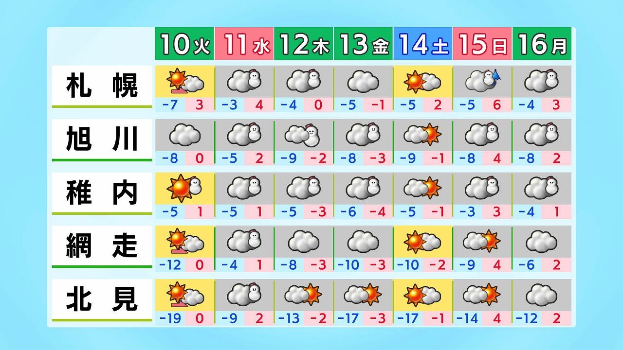 水曜は道北の山沿いで10~20センチの湿った雪が降ります。今週は荒れた天気になる可能性は低いでしょう。札幌の積雪は減っていく傾向です。