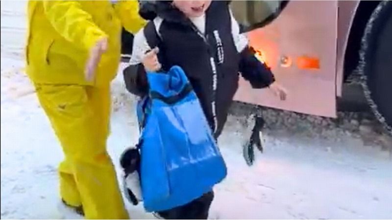 バスが着くと先生が急いで降りてきて、手には何か入ったビニール袋を持っていました。