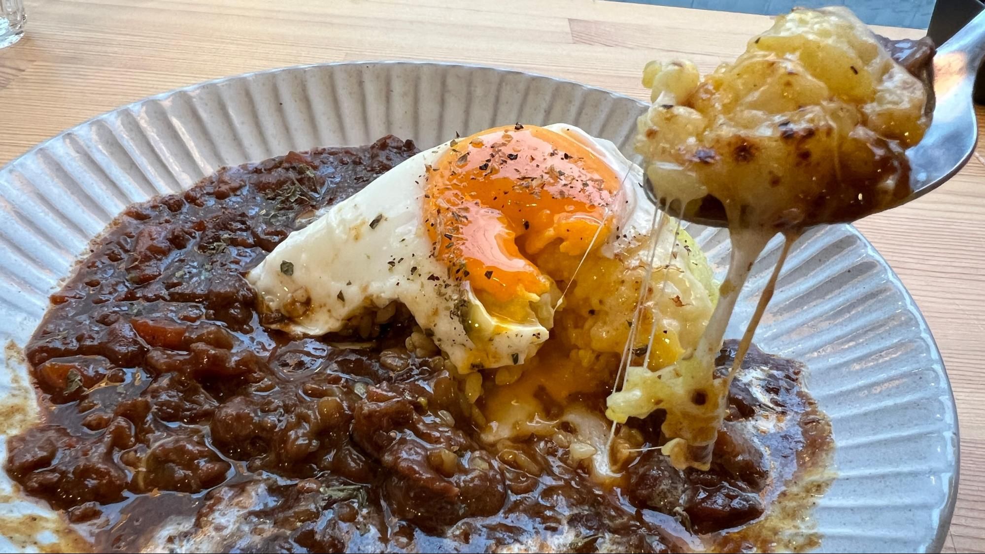 ドーム上のごはんの上には、炙りチーズと目玉焼きがのっていて、見た目からも食欲をそそります。