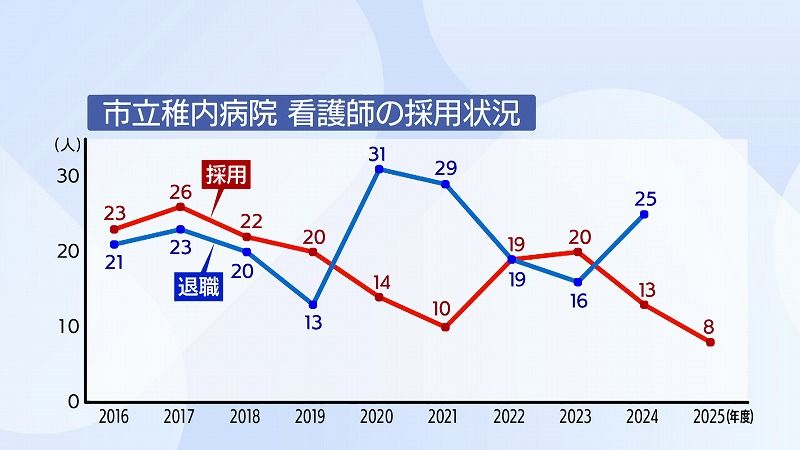 市立稚内病院の過去10年間の看護師の採用状況です。