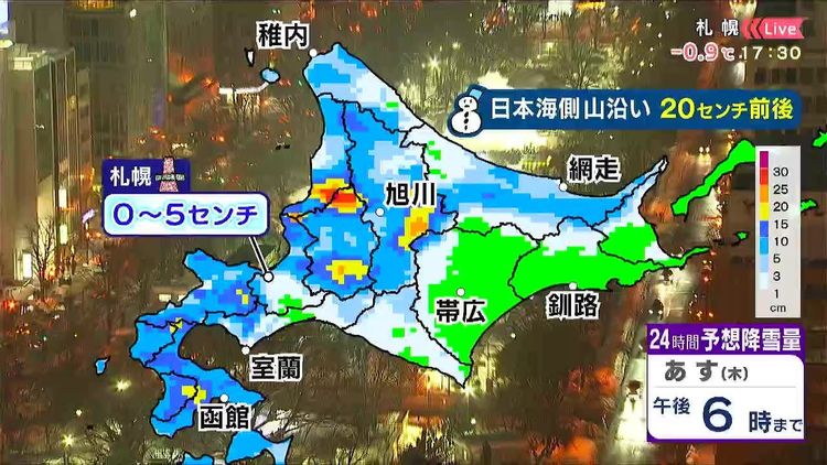 あす12日(木)午後6時までの24時間予想降雪量です。黄色やオレンジのエリア、日本海側の山沿いで20センチ前後でしょう。札幌では、雪の量は少ない見込みです。