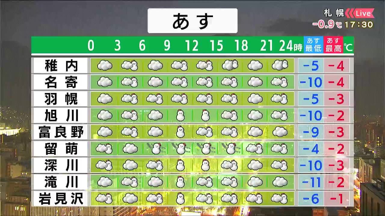 倶知安や江差、函館は雪が降りやすいでしょう。札幌などその他も昼頃は雪の降るところが多くなります。