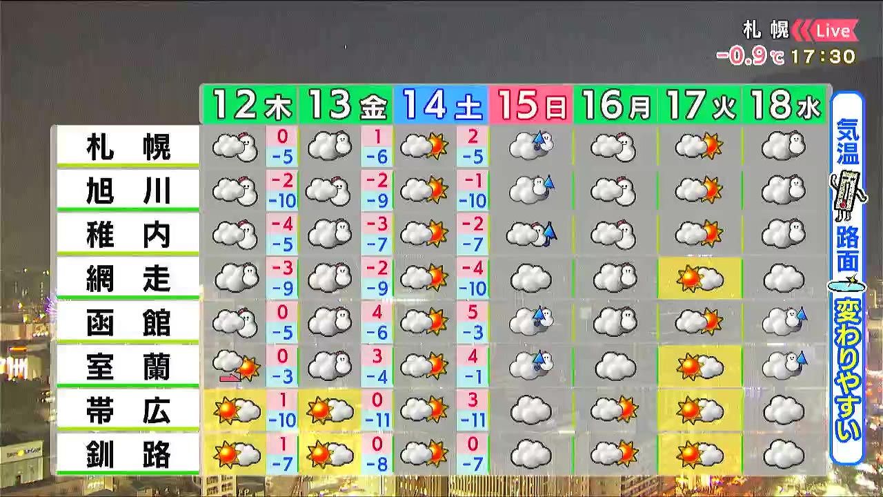 金曜も道北の内陸で雪が強まります。土曜は晴れますが、日曜は気温が上がって雨や雪が降るでしょう。気温や路面状況の変化に注意して下さい。