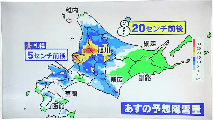 あす13日の予想降雪量です。日本海側を中心に広く雪が降ります。黄色やオレンジのエリア、きのうから積雪が急増している層雲峡周辺(氷瀑まつりは3月8日まで開催中)、旭川や幌加内町周辺の上川地方、深川や滝川周辺の空知地方で20センチ前後です。