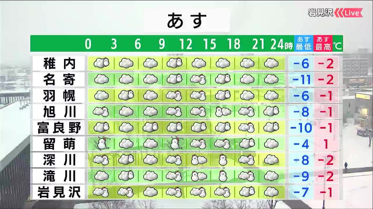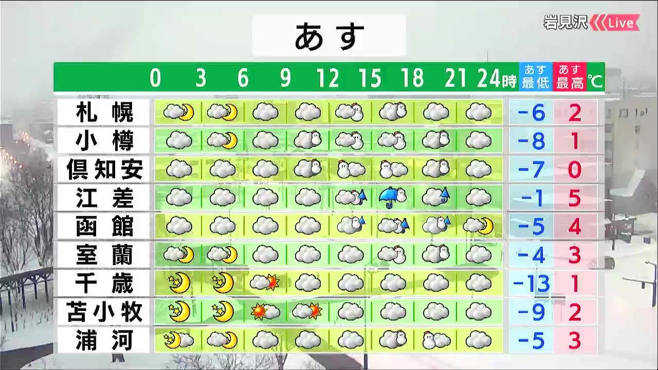 広く雪が降り、きょう12日(木)と同じくらいの寒さが続きます。道南は最高気温がきょうより4度ほど高くなって、雨がまじるでしょう。