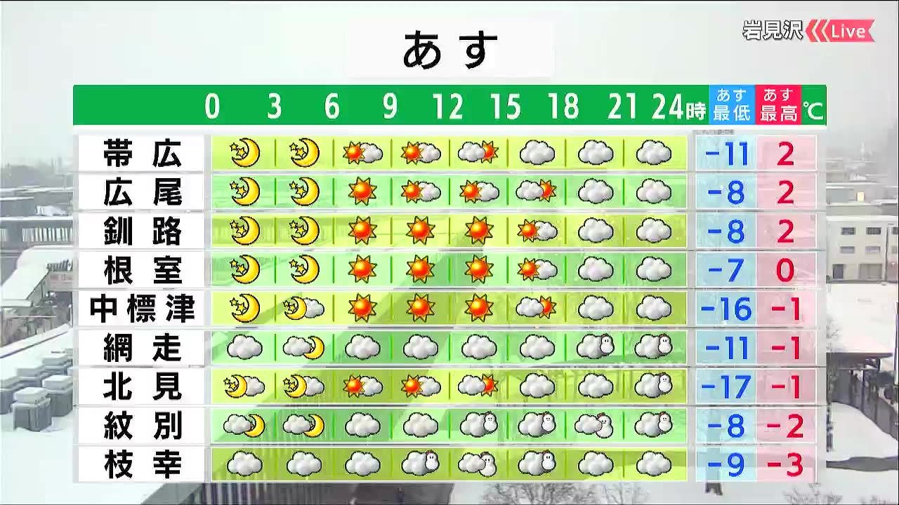 道東や北見は晴れるでしょう。オホーツク海側の海岸部で午後、雪の降る時間がありますが、降る雪の量は少ないでしょう。