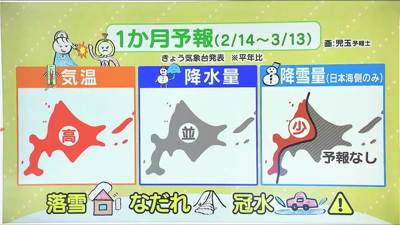 上空の寒気の影響を受けにくく、気温は平年より高い予想です。一気に雪どけが進むこともあるので、落雪やなだれ、雪どけによる道路の冠水などにいつもよりも注意して下さい。