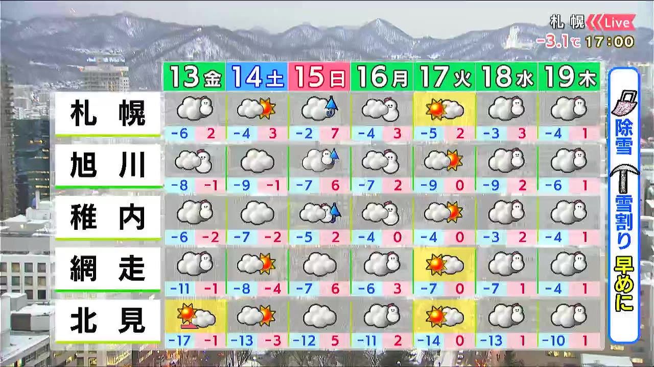 土曜日は雪がやみ、穏やかでしょう。日曜は札幌で7度、旭川で6度まで気温が上がり、雨が降ります。家の周りの除雪や雪割り作業を進めておきましょう。