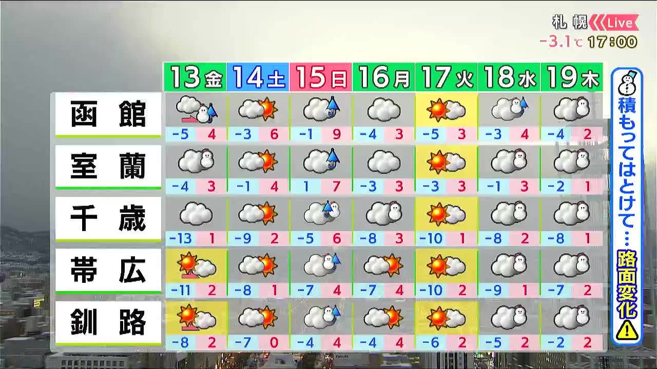 2日おきの周期で雪や雨が降ったり、晴れたりします。日曜は函館で9度まで気温が上がるでしょう。昼間はプラス、朝晩はマイナスの気温で路面状況が変わりやすくなります。