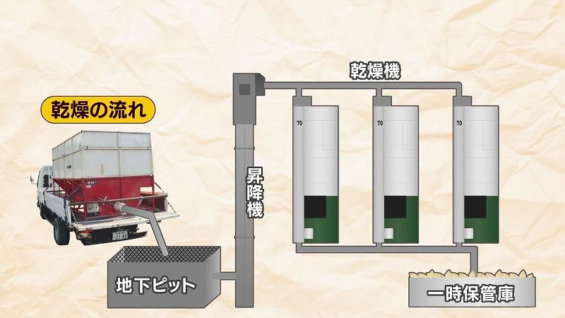 そこから昇降機と呼ばれる機械で高さ約5.5メートルまで持ち上げられ、3基ある乾燥機に振り分けて入れられます。