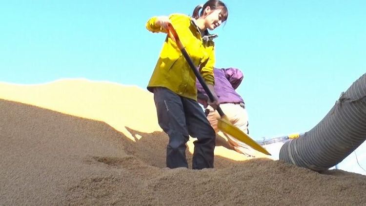 トラックの荷台いっぱいになったもみ。次は「乾燥場」に運びます。、
