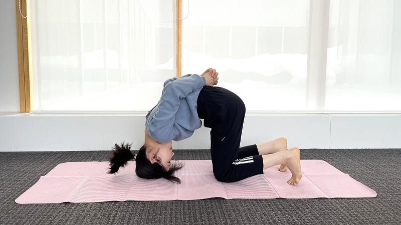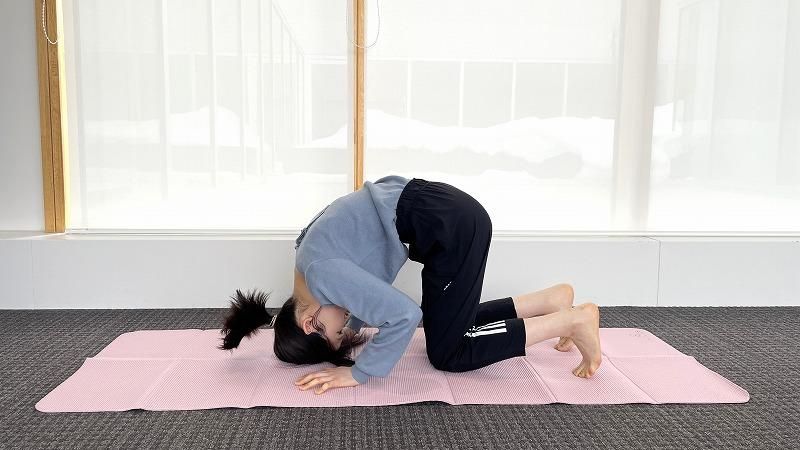 首を痛めないために、頭頂部を床につけたら視線はずらさず、顔も動かさないことを意識してください。