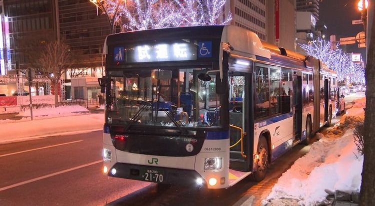 1月、イルミネーションがきらめく札幌駅前通りには市民にはおなじみ、青と白のバスが…いつもより長い?バス2台をつないで1台にした「連節バス」。長さは18mあります。