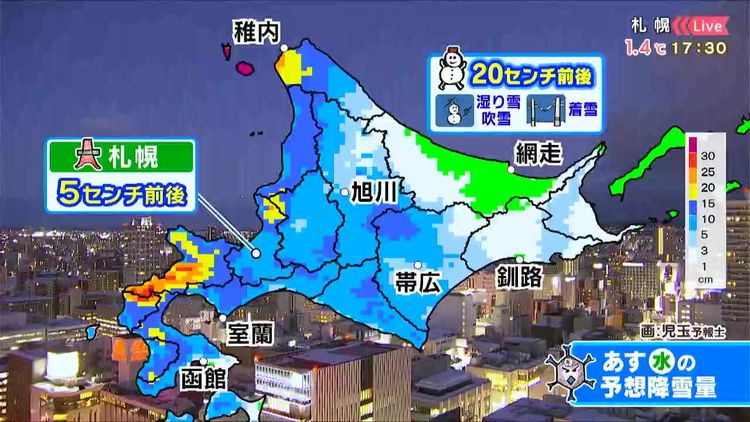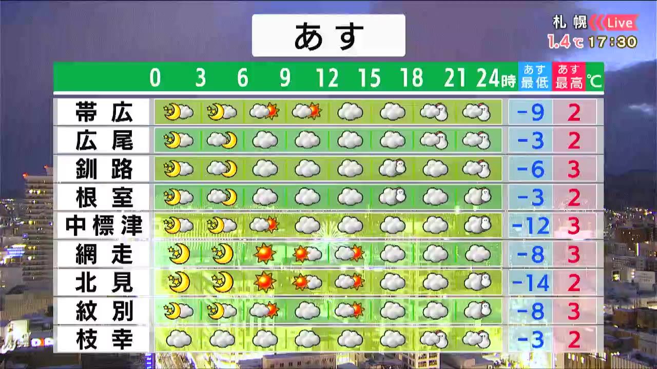 日中はオホーツク海側を中心に晴れ間があるでしょう。夜は天気が崩れますが、気温が高く、湿った雪になりそうです。