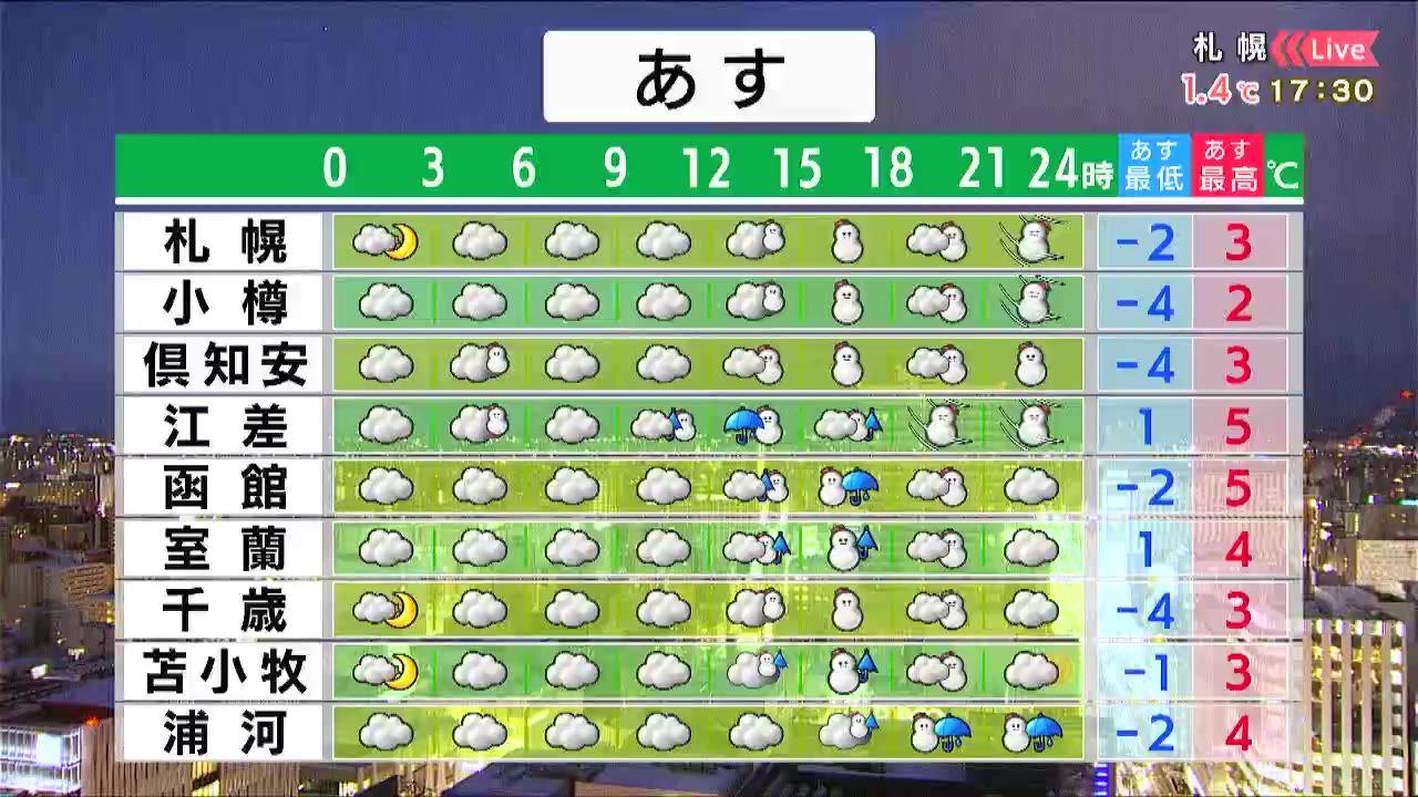 あす18日(水)の時間ごとの天気。道央・道南からです。