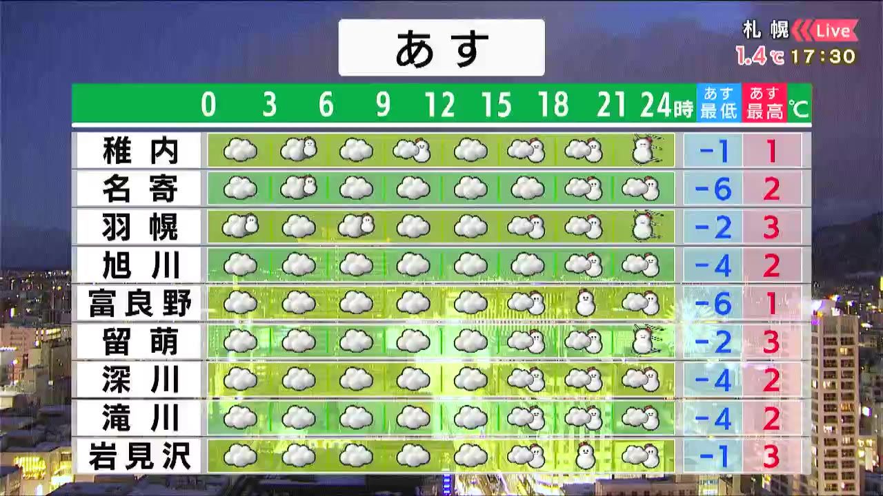朝の雪は弱いですが、夕方以降は雪や風が強まるでしょう。宗谷地方ではあす18日(水)夜から吹雪や吹きだまりによる交通障害、落雷や突風にも注意が必要です。