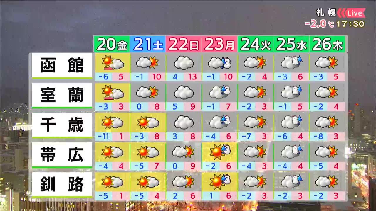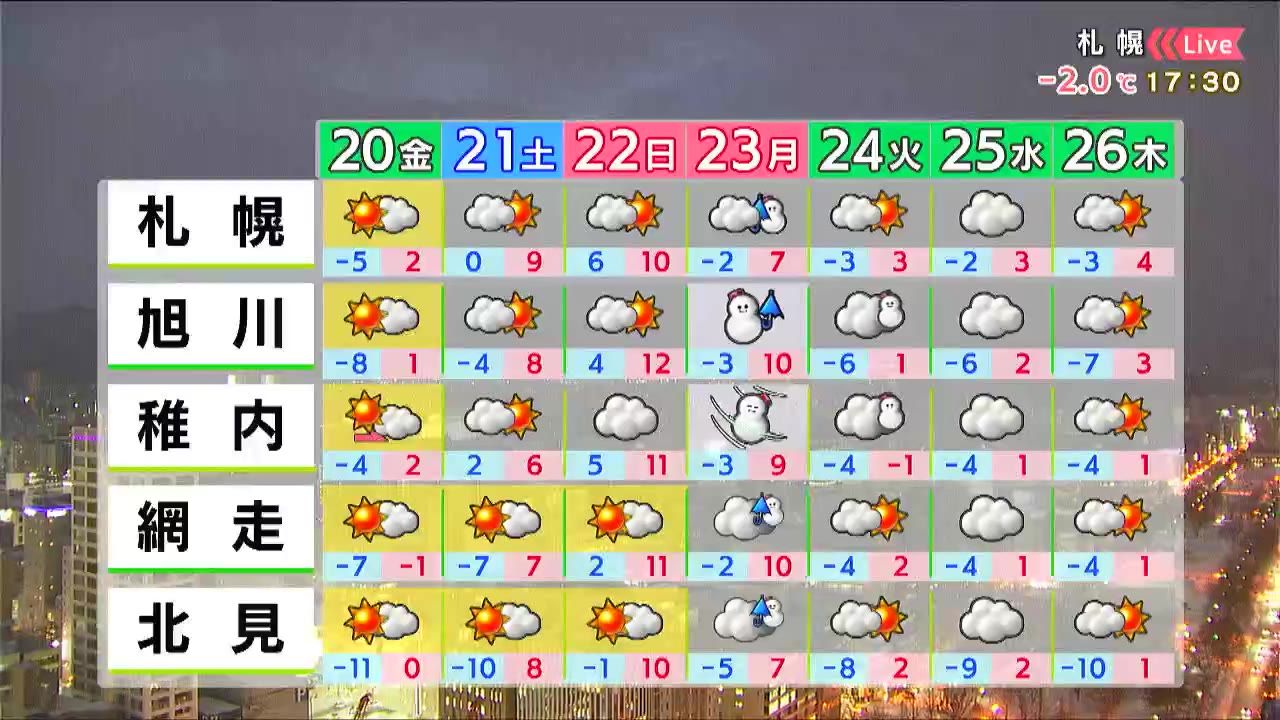 ※19日午後5時時点の情報です。最新の気象情報は、HBCウェザーセンターのホームページなどでご確認ください。HBCは気象庁の認可を2001年に得て以来、民間気象会社の一つとして「HBCの独自予報」を発信しています。