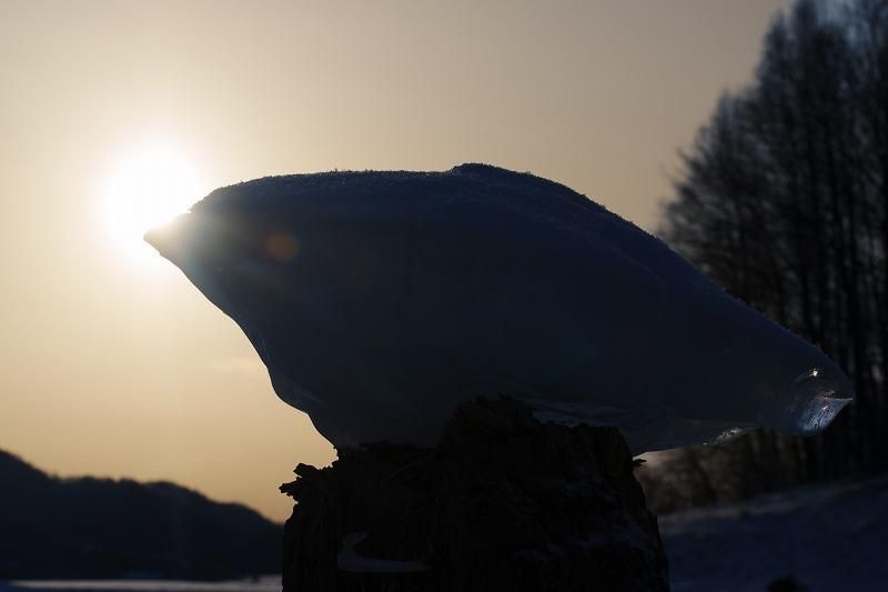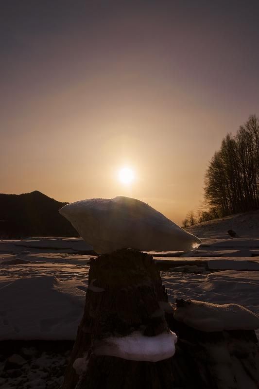 ダムの発電放水などで湖の水位が下がり、切り株の上に氷だけが取り残されます。