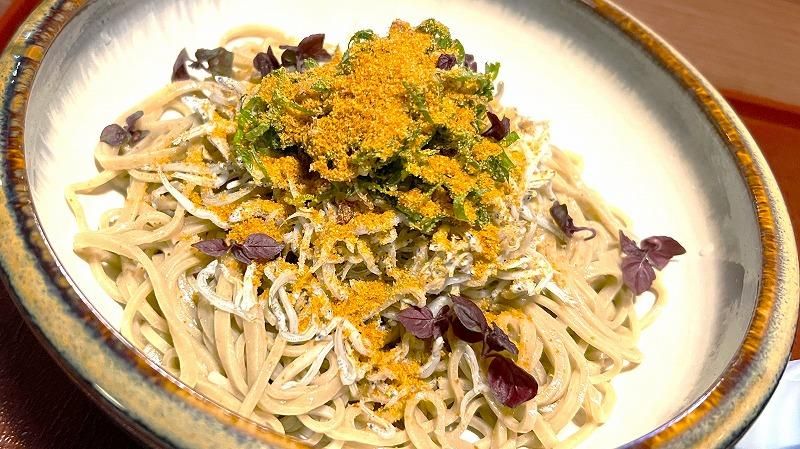 「しらすとからすみ」のぶっかけ蕎麦です。