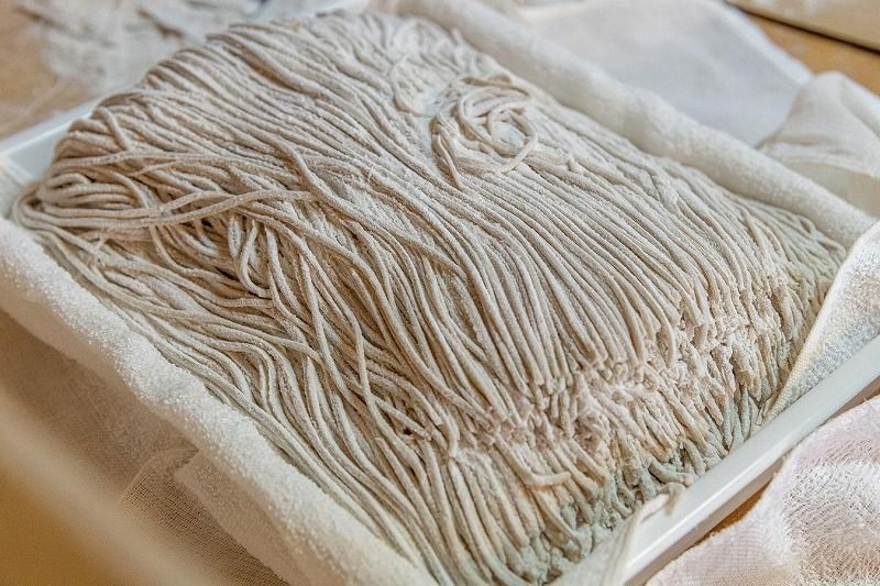 そば玉をのし棒で薄くのばし、生地を次々と重ね、年季の入ったそば切り包丁で一定のリズムを刻むように切っていく。100年近く変わらない朝の景色だ。