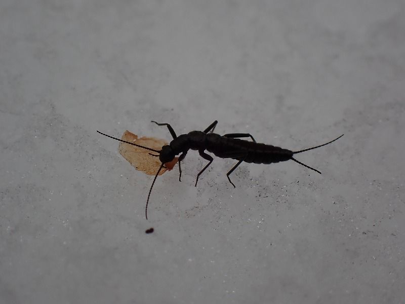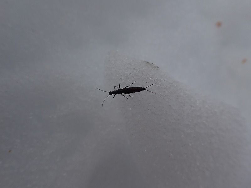 大きさは1.5センチメートル程度で細長い形をしています。夏の間は川の中で幼虫時代を過ごして、雪が降る頃に成虫になって陸に上がってきます。寒すぎても動かないので、気温が0度前後で雪晴れた日によく見かけます。
