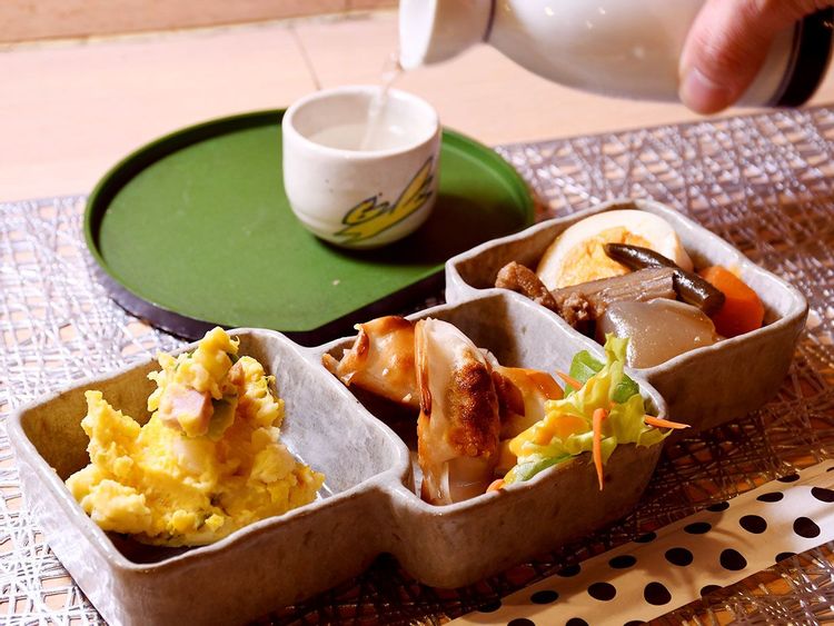 お酒が2杯と、日替わりの惣菜が3品。取材日は、ポテトサラダに餃子、煮物と和洋中を押さえた盤石の布陣。