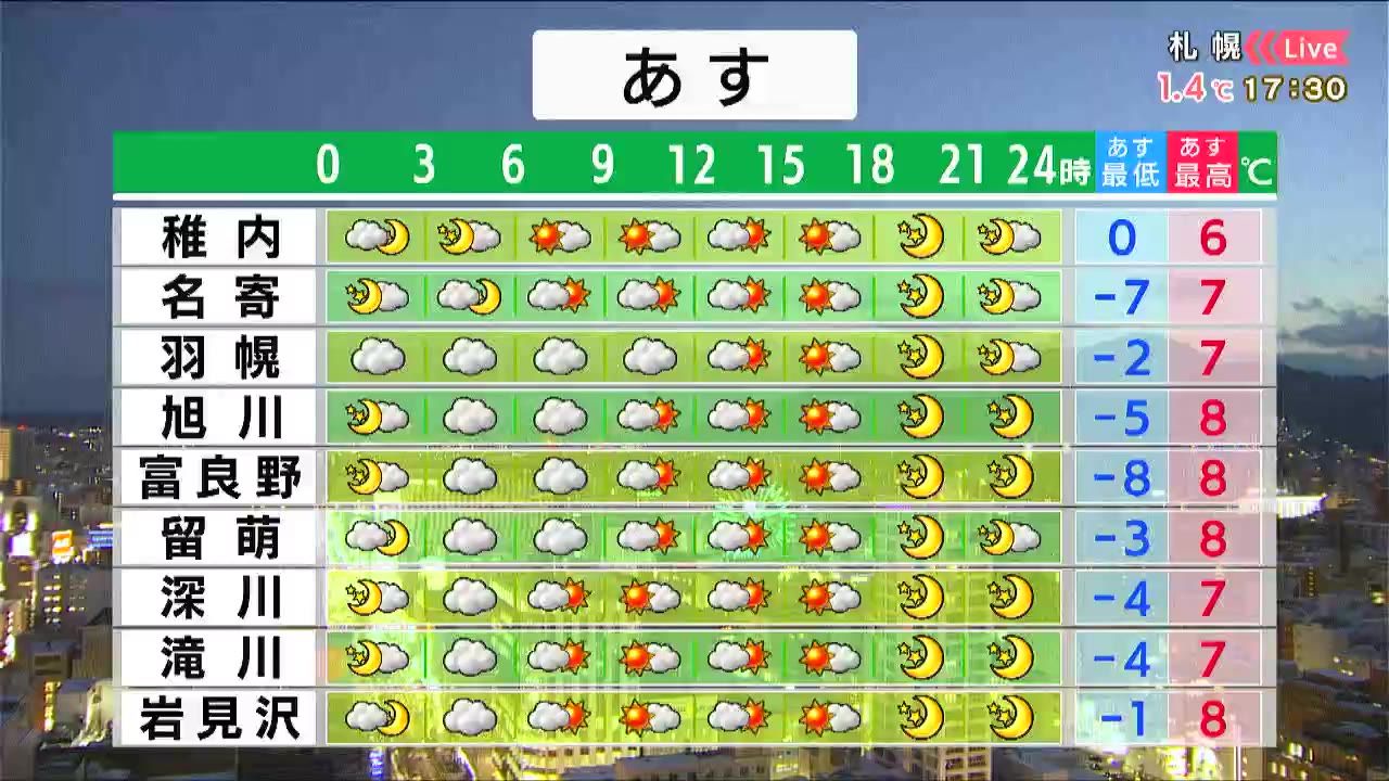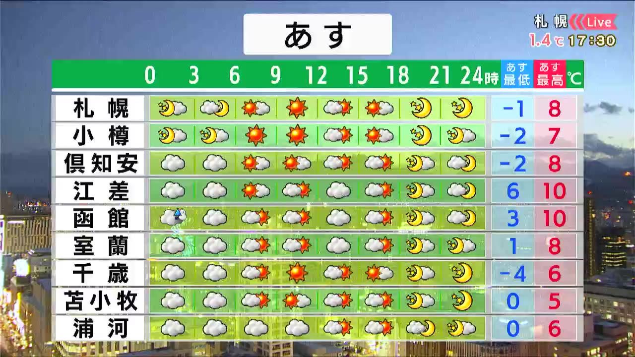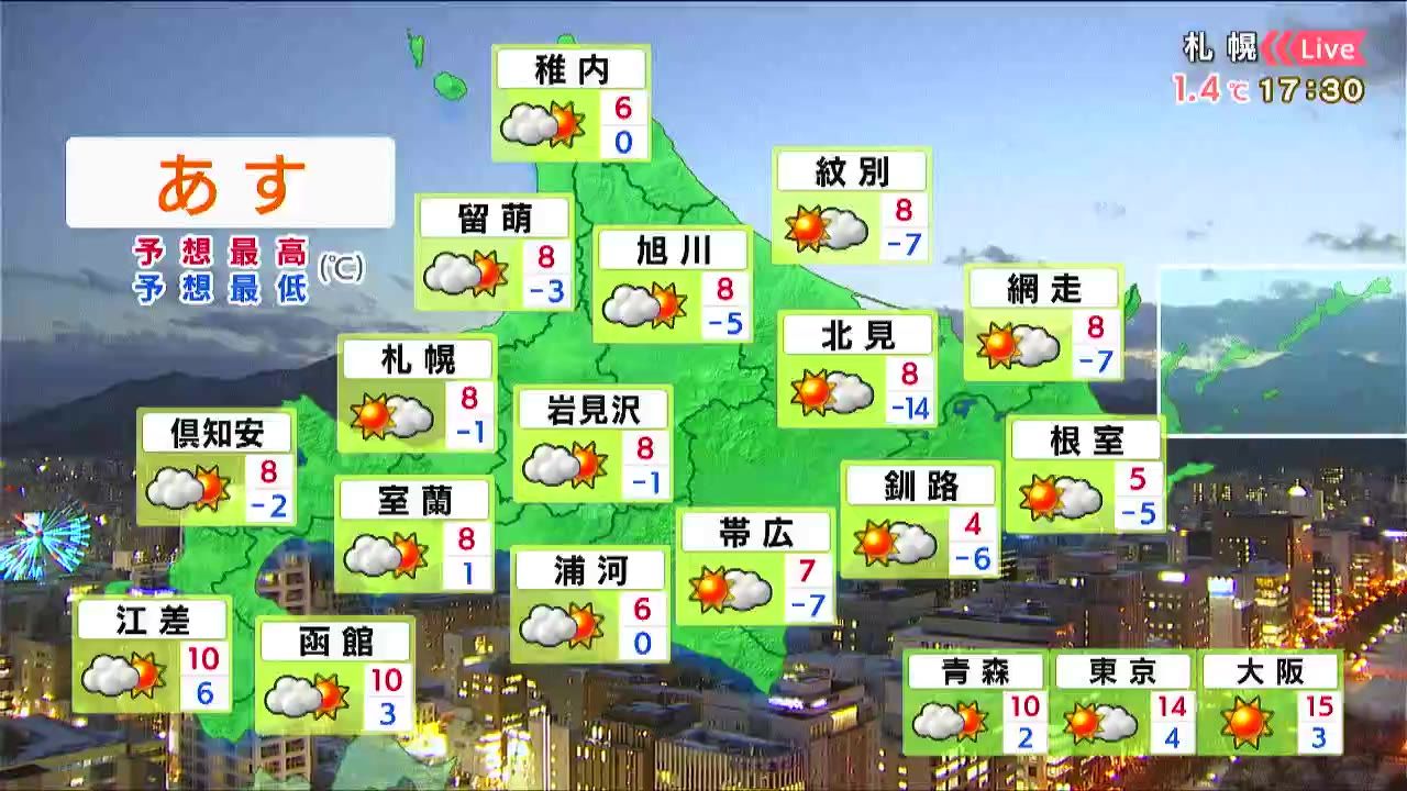 札幌と小樽は朝から晴れて、積もった雪が解けそうです。軒下など危険な場所には近づかないようにしてください。道南の朝は雲がかかるでしょう。