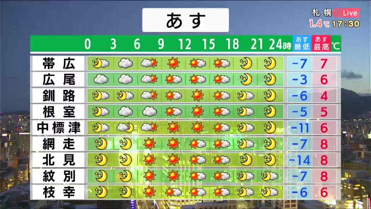 帯広、釧路、根室などは朝は雲がかかりますが、昼前には晴れてくるでしょう。オホーツク海側は午前を中心に晴れる見込みです。