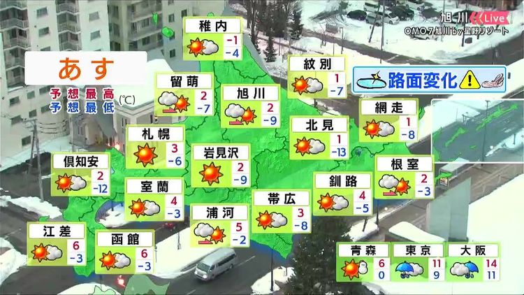 各地で穏やかに晴れるでしょう。最低気温はけさより4度ほど低く、札幌は‐6度です。最高気温はきょう24日(火)とほぼ同じで、広くプラスです。路面状況の変化に注意してください。
