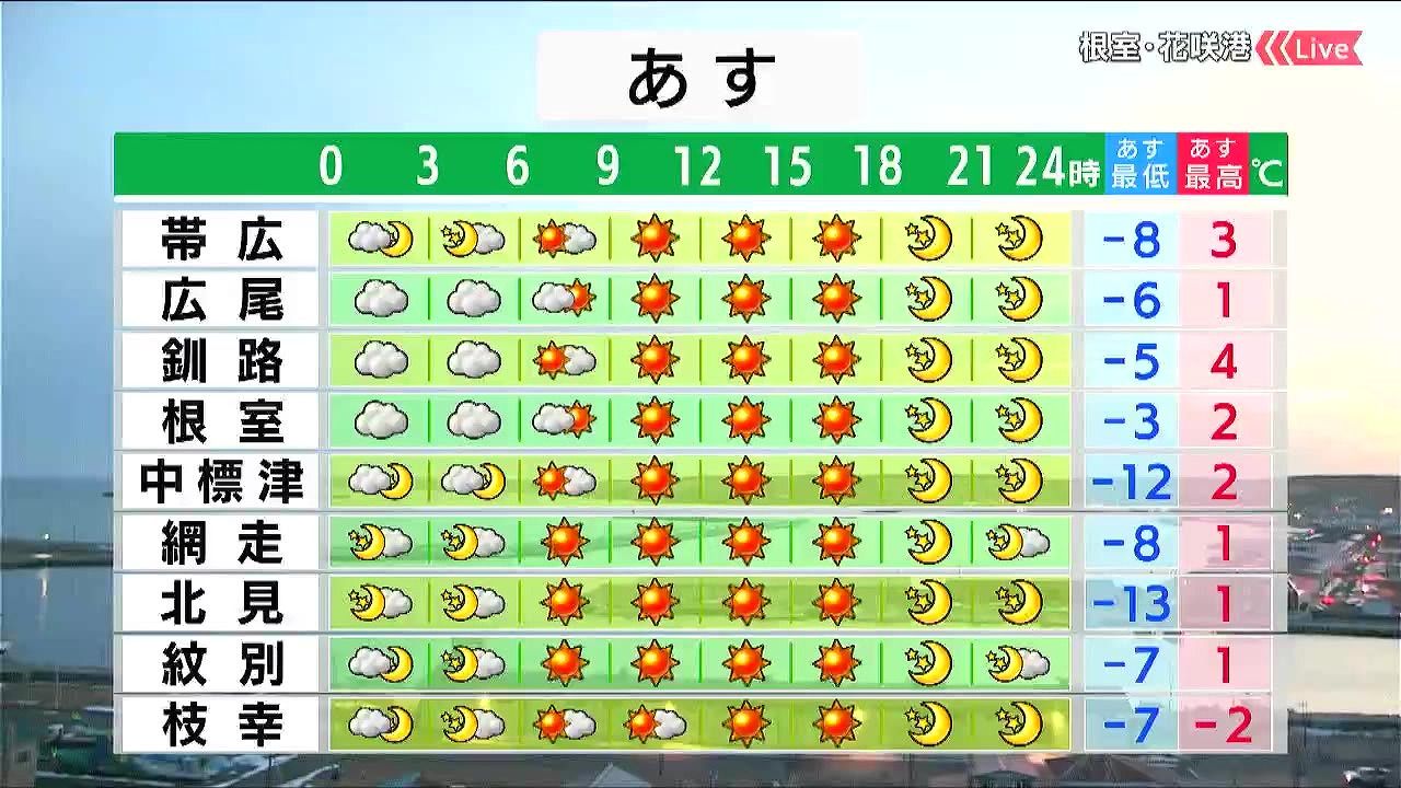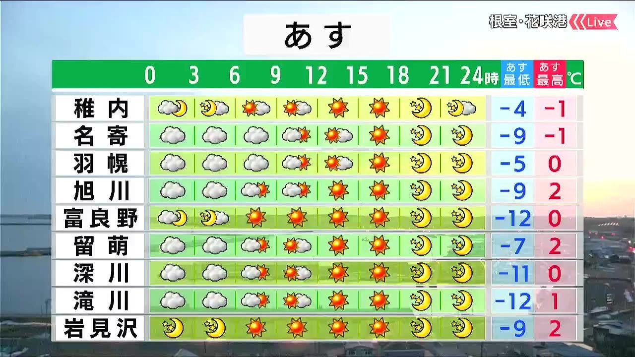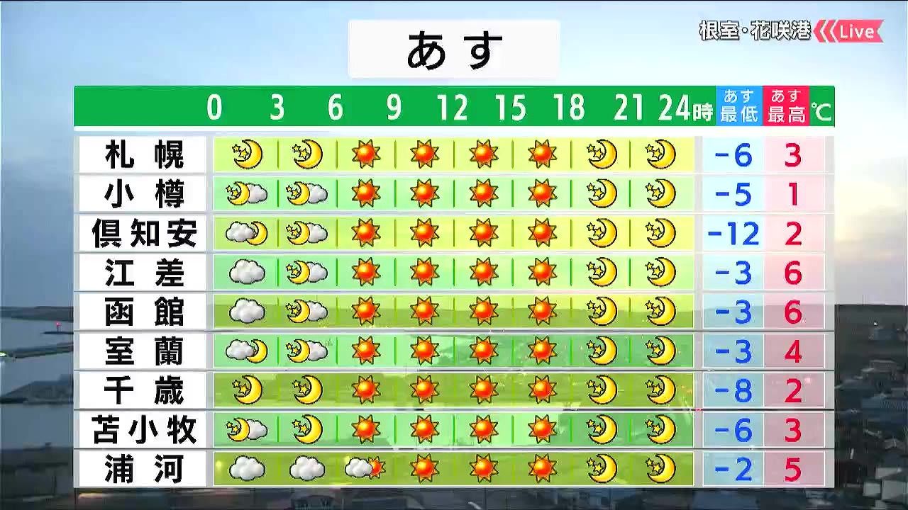 浦河は朝まで雲が広がりますが、その他は朝からよく晴れるでしょう。晴れても札幌など、きょうと同じくらいの寒さが続きます。服装選びに気を付けて下さい。