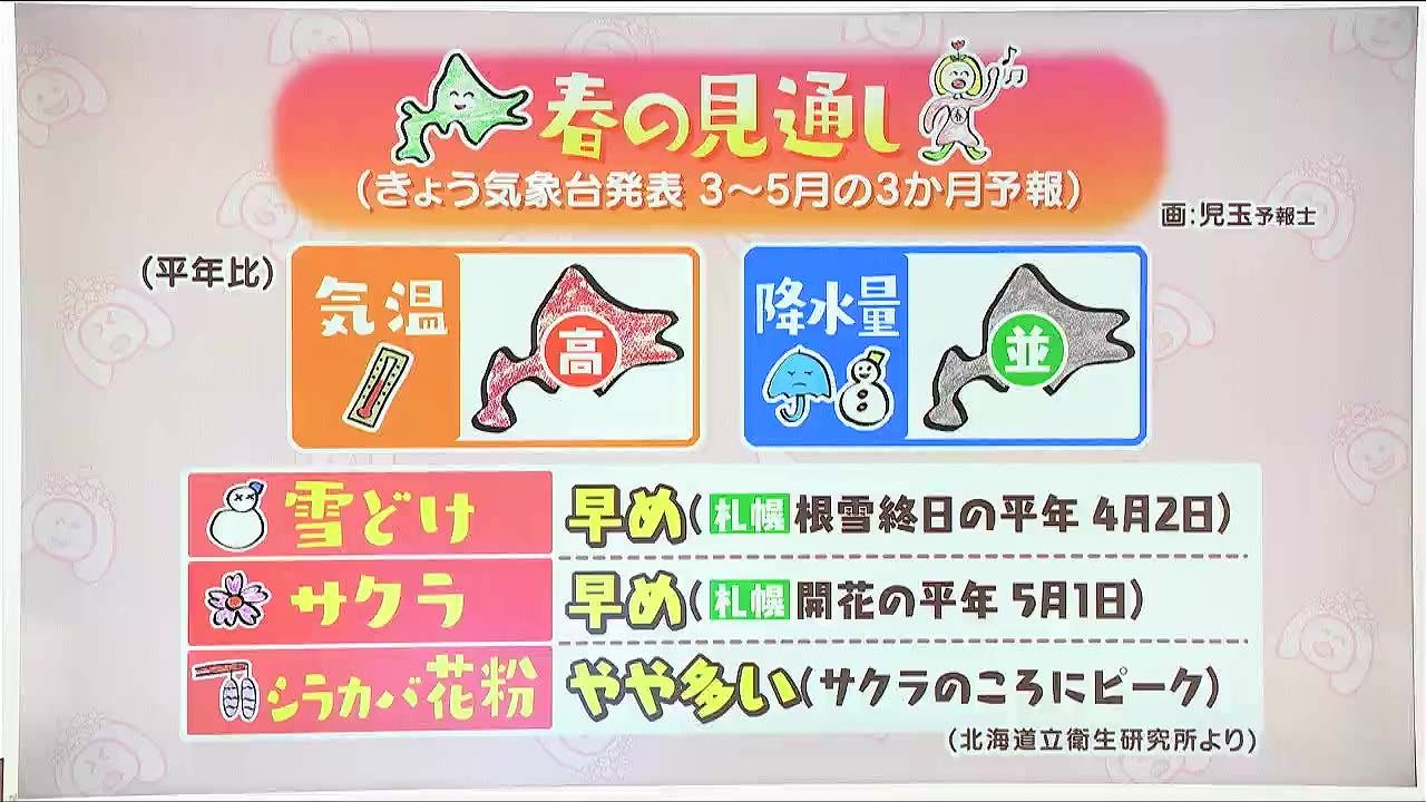 暖かい空気に覆われやすいため、気温は平年より高いでしょう。降水量は平年並みです。ということで、雪どけは急ピッチで進みます。札幌の根雪が終わる平年は4月2日ですが、3月中に積雪ゼロになりそうです。雪どけによる川の増水などに注意して下さい。気温が高めなのでサクラの開花も早く、サクラと同じ時期に飛ぶシラカバ花粉も例年より早めの対策が必要です。道立衛生研究所によると、花粉の量は例年よりやや多くなりそうです。