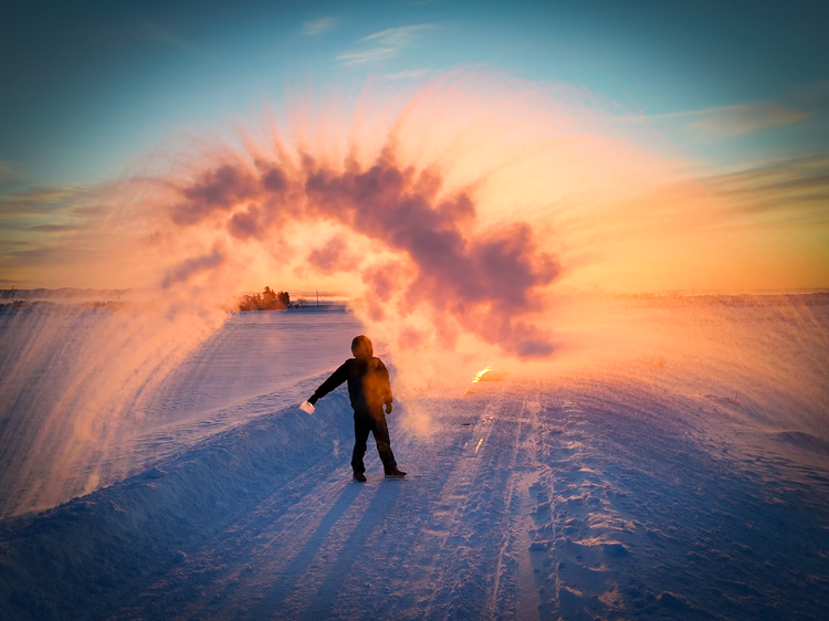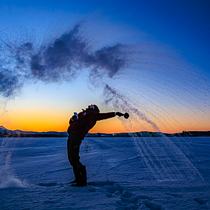 気温がマイナス20度を下回る屋外で、熱湯を空中にまくと、一瞬で蒸発し凍結して、花火のように放射状に広がるのをご存じでしょうか?