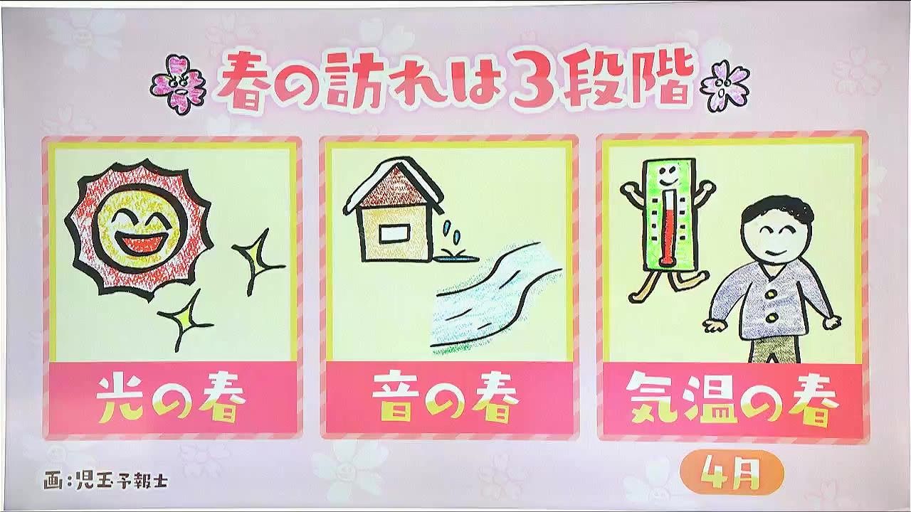 突然ですが、春の訪れは3段階でやってきます。まずは、日が長くなり日ざしも強まってくる「光の春」。そして、雪どけ水の流れる音が聞こえる「音の春」。最後に暖かくなる「気温の春」です。