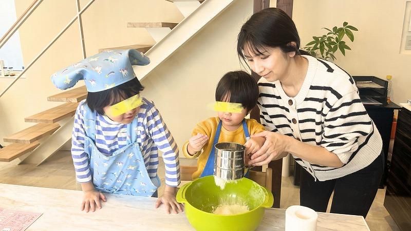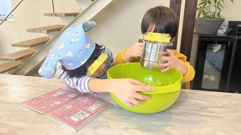特に、薄力粉をふるいにかける作業が面白かったようで、兄弟で粉ふるい器の争奪戦!