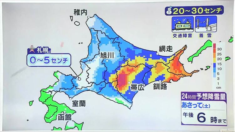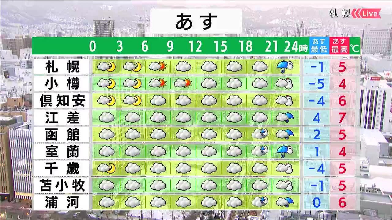 稚内や羽幌など北の地域は日が差しますが、富良野や空知地方は雲に覆われ、夜遅くは岩見沢周辺で弱い雪が降りそうです。気温は高めで、雪どけは進むでしょう。