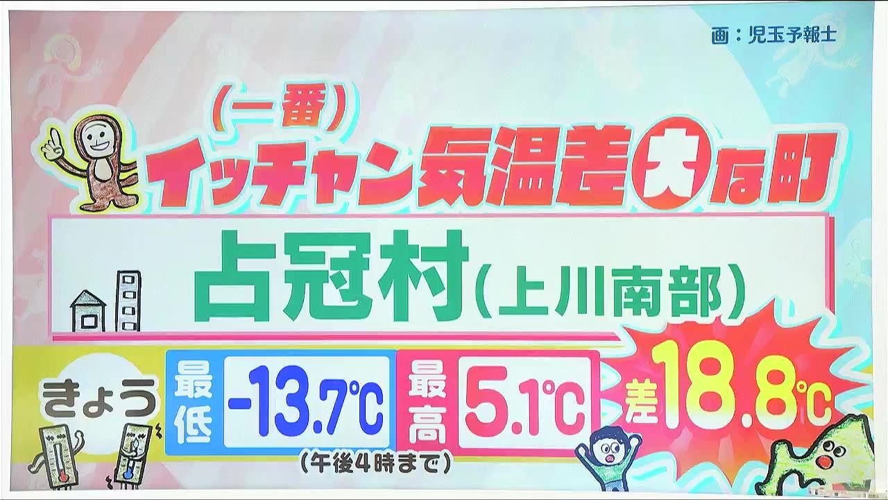 イ~ッチャン朝と日中の「気温差が大きくなった」町です。穏やかに晴れた今朝は、放射冷却の影響で-13.7度まで気温が下がりましたが、日中は日差しと上空の暖かい空気の影響でプラス5.1度まで上がり、その差は18.8度でした。気温差が大きくなることも、春へ近づいている感じがします。