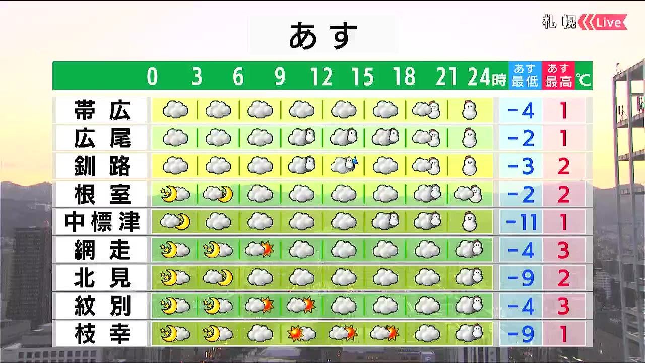 広尾や釧路など道東の海岸部で、昼頃から弱い雪が降るでしょう。オホーツク海側は日中は割合穏やかです。最高気温は帯広で1度など、この時期らしい寒さでしょう。