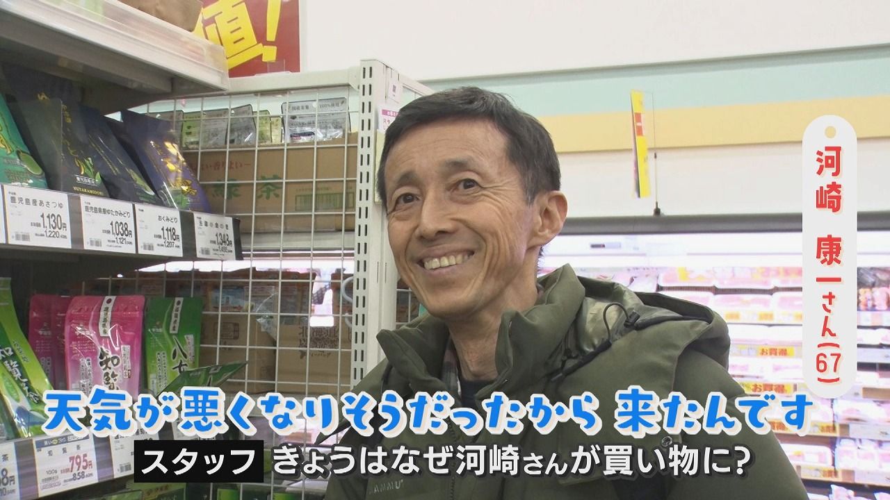 番組スタッフ:「いつもは妻が買い物担当?」河崎さん:「そうです。天気が悪くなりそうだからきたんです」