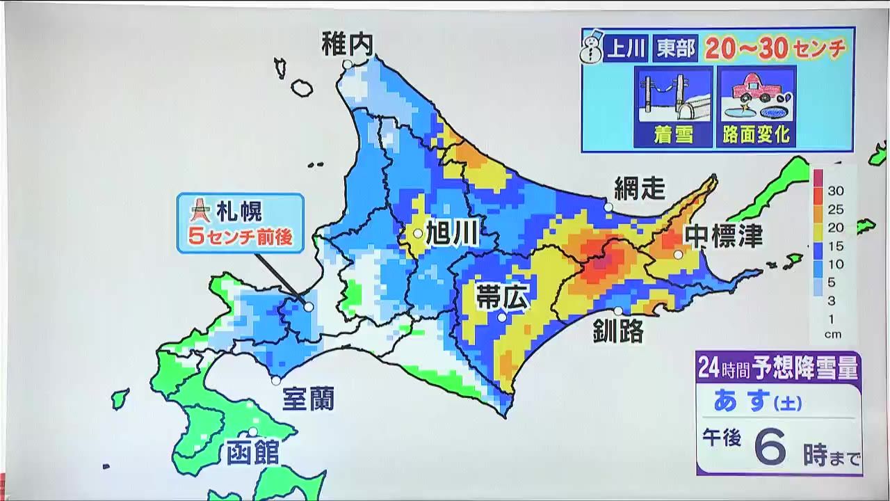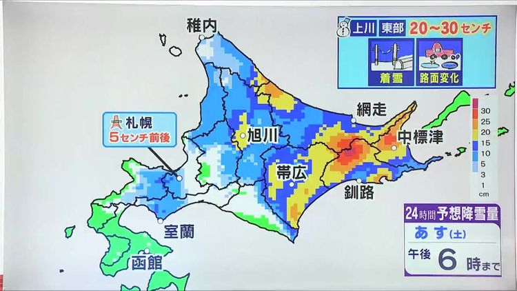 これからあす28日(土)午後6時までの24時間予想降雪量です。北部や東部で濃い青、広く10センチ前後です。旭川周辺では15~20センチ、オレンジや赤の中標津や阿寒湖など東部の内陸や、上川北部でも局地的に30センチの大雪になるおそれがあります。湿った雪による着雪、路面状況の変化にも注意して下さい。札幌は5センチ前後でしょう。