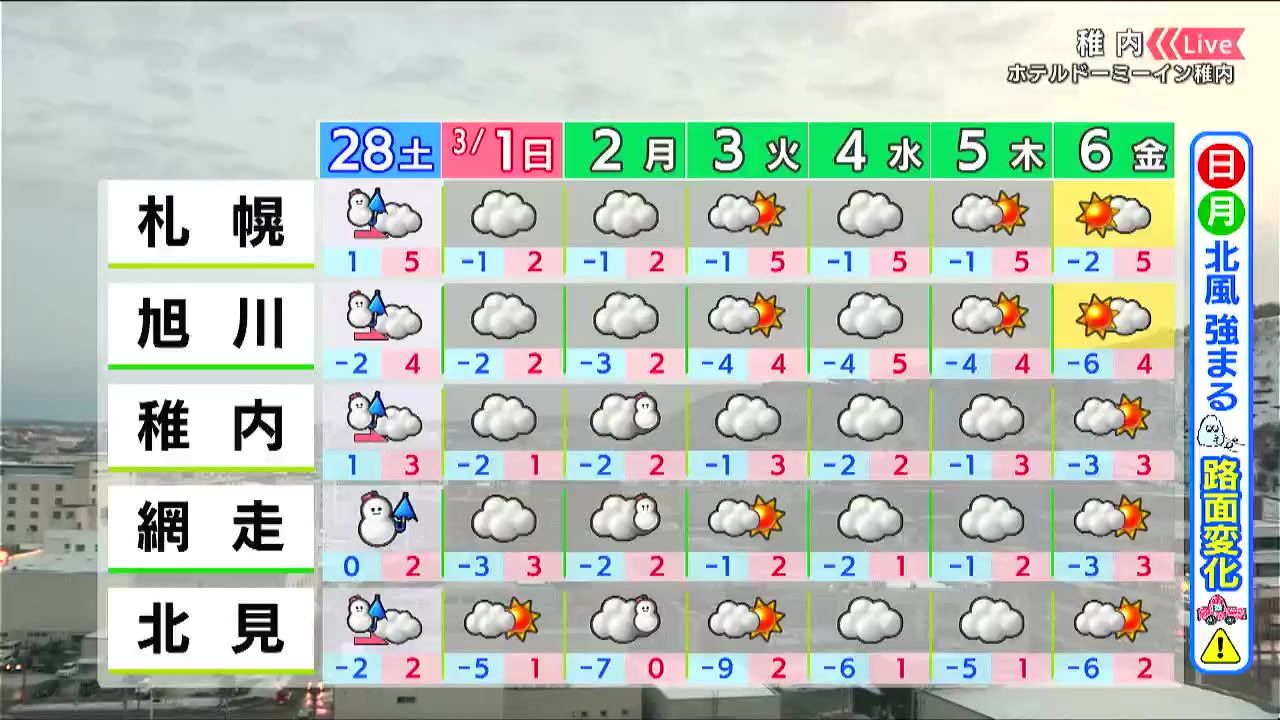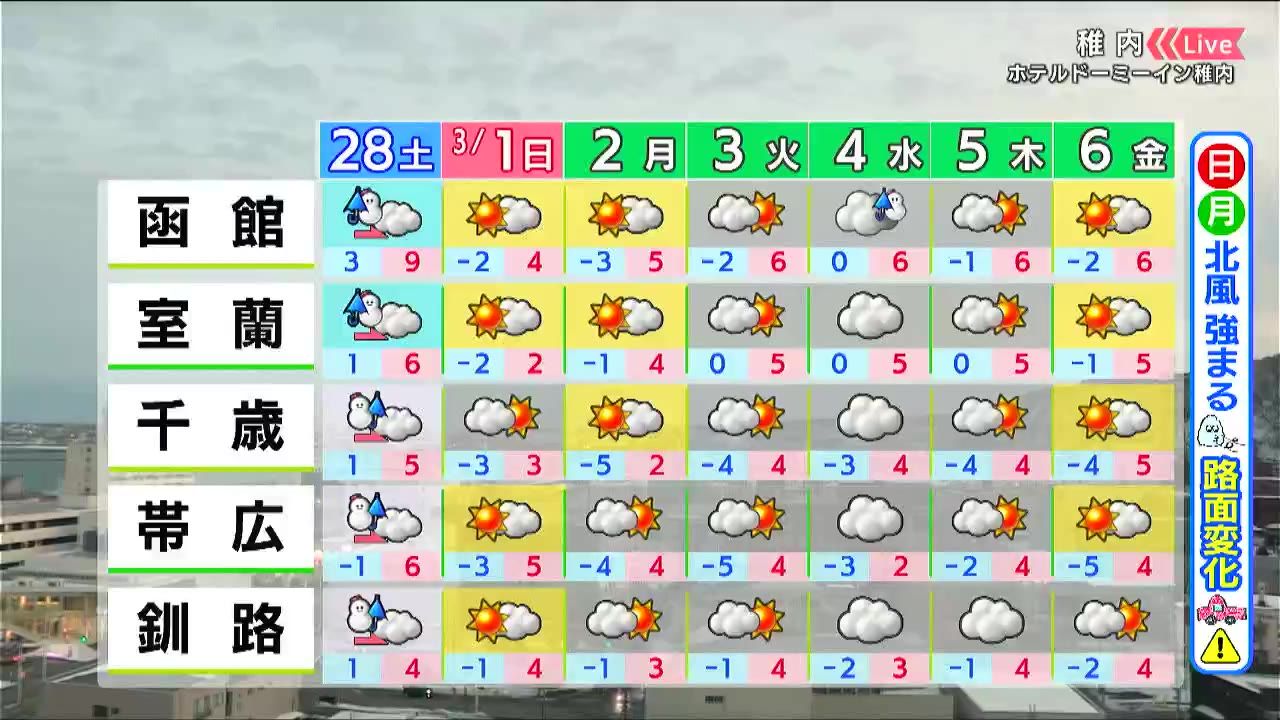日曜と月曜は晴れても風が冷たいでしょう。気温は平年並みかやや高く、あす28日(土)降る雪はとけていくでしょう。ただ、路面凍結には注意して下さい。